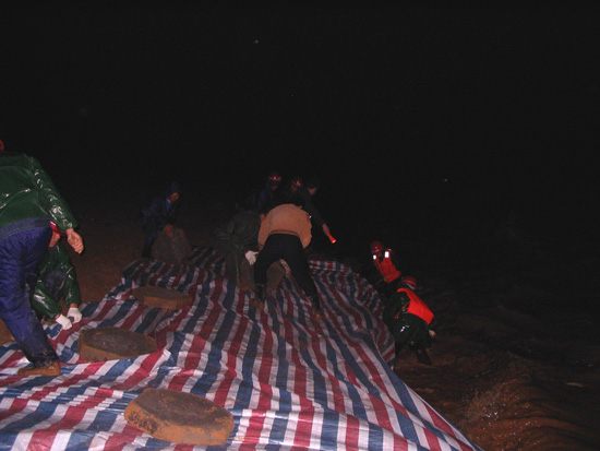 根據以往的施工經驗,我們很快啟動了搶險應急預案。但由于環境惡劣,考驗我們的時候到了,要發揚我們江西水建人“特別能吃苦、特別能戰斗、特別能忍耐、特別能協作精神”的時候到了,我們與洪水搶時間、爭進度,全體干群在漆黑的大堤上是一片穿梭奔跑的身影,大家齊心協力,手提肩扛,把一百多斤一塊的混凝土預制塊,一塊塊運到堤腳,此時項目部總工曾俊平不顧江水的寒冷,帶領其它幾名員工,奮身躍入水中,在水下鋪設彩條布,而此時水下溫度只有10℃左右,渾濁江水一浪高過一浪拍打在他們的身上。大家顧不上寒冷,顧不上疲勞,顧不上饑餓,衣服濕了又干,干了又濕,分不清是哪次被汗水還是雨水弄濕的,在微弱的手電光照亮下鋪設了一條又一條彩布條,碼起了一道又一道沙包小堤。經過大家的緊張奮戰,終于幾處險情得到了控制,等到我們在忙碌中回過神來時,已經是次日的凌晨三點多鐘,盡管大家拖著一副疲憊不堪的泥身子,但大家臉上裝滿了滿意和勝利的微笑,王總此時飽含真情地對大家說了一聲:“大家真的辛苦了,謝謝大家!”走在回家的路上,我正好與項目總工曾俊平走在一起,我看到他渾身濕漉漉的,我關心的問他在水中冷嗎?他笑笑說道:“這是關鍵時刻,再冷也要下”。他旁邊的同事告訴我,他是從下午三點鐘就一直在水里做事直到剛才,整整在水中浸泡了十二個小時。我們參加搶險的同志被曾俊平這種不怕困難、不畏艱險、不顧個人安危、敢于吃苦的精神深深感動著,真是我們學習的好榜樣!