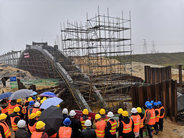 首日,學(xué)習(xí)團(tuán)冒著寒風(fēng)和細(xì)雨,先后參觀了西干渠三區(qū)地下頂管技術(shù)現(xiàn)場(chǎng)、渡王家渡拱式渡槽技術(shù)現(xiàn)場(chǎng),一分干渠曾家渡碗式渡槽完工段。彭燦華、曾俊平、馬小毛等項(xiàng)目管理人員,先后就技術(shù)特點(diǎn)、質(zhì)量安全控制要點(diǎn)、技術(shù)方案比選、經(jīng)濟(jì)效益分析等,向?qū)W習(xí)團(tuán)一行作了介紹。